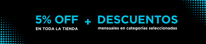 Depende de la promoción: el descuento del 5% en toda la tienda no se acumula con las promociones mensuales aplicadas a categorías específicas (por ej. 10% OFF en notebooks).